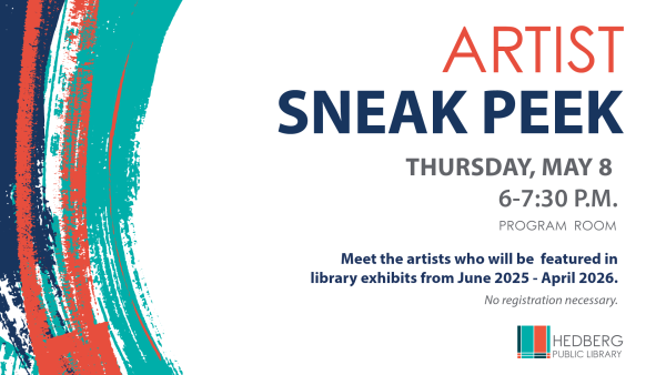 Join us for a sneak peek of the artists who will have exhibits at the library from June 2025-April 2026 and their work on Thursday, May 8 from 6-7:30 p.m. in HPL's Program Room. Speak with the artists and learn how they started and what motivates them to create their beautiful pieces.