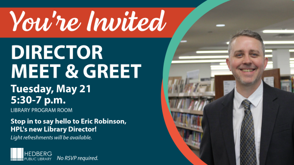 The public is invited to stop in to HPL's Program Room to say hello to Eric Robinson, HPL’s new Library Director, on Tuesday, May 21 from 5:30-7 p.m. Light refreshments will be available; no registration is required.