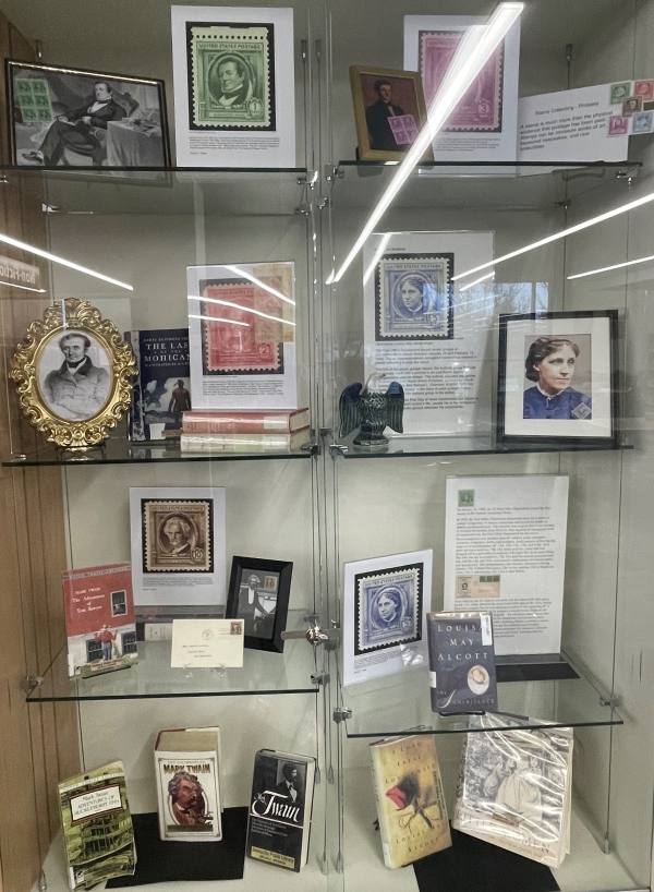 Woodruff Case 1 showcases 1940 Edition Stamps of Famous Authors, including: