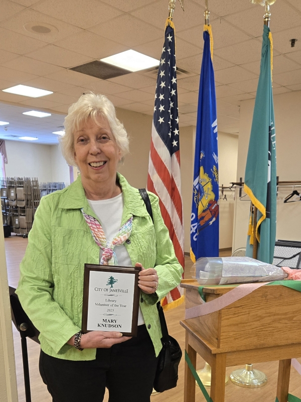 Mary Knudson, Vice President and Treasurer of the Friends of Hedberg Public Library, was awarded the City of Janesville's Library Volunteer of the Year Award. A dedicated volunteer since 2016, Mary also volunteers two mornings a week in The Ground Floor.