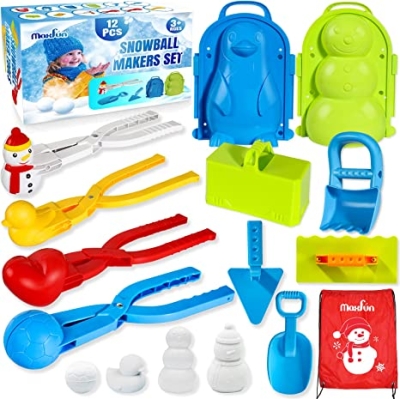 12 piece set includes: 1 snowman maker, 1 heart snowball maker, 1 snow bricks maker, 1 spatula, 1 snowman mold, 1 snow shovel, 1 duck snowball maker, 1 football snowball maker, 1 triangle snow spade, 1 snow penguin mold, 1 snow digger, 1 carrying bag : plastic.
